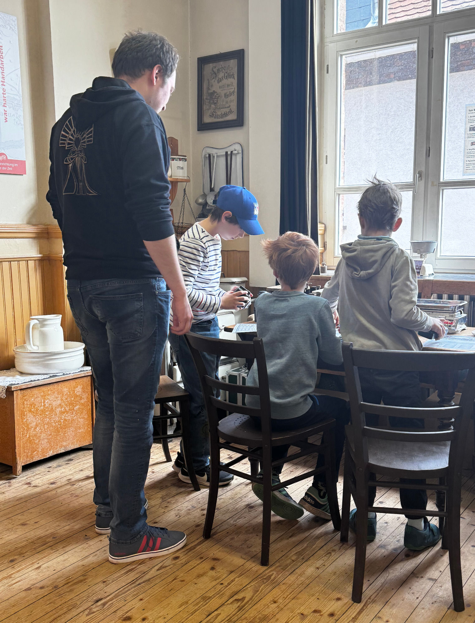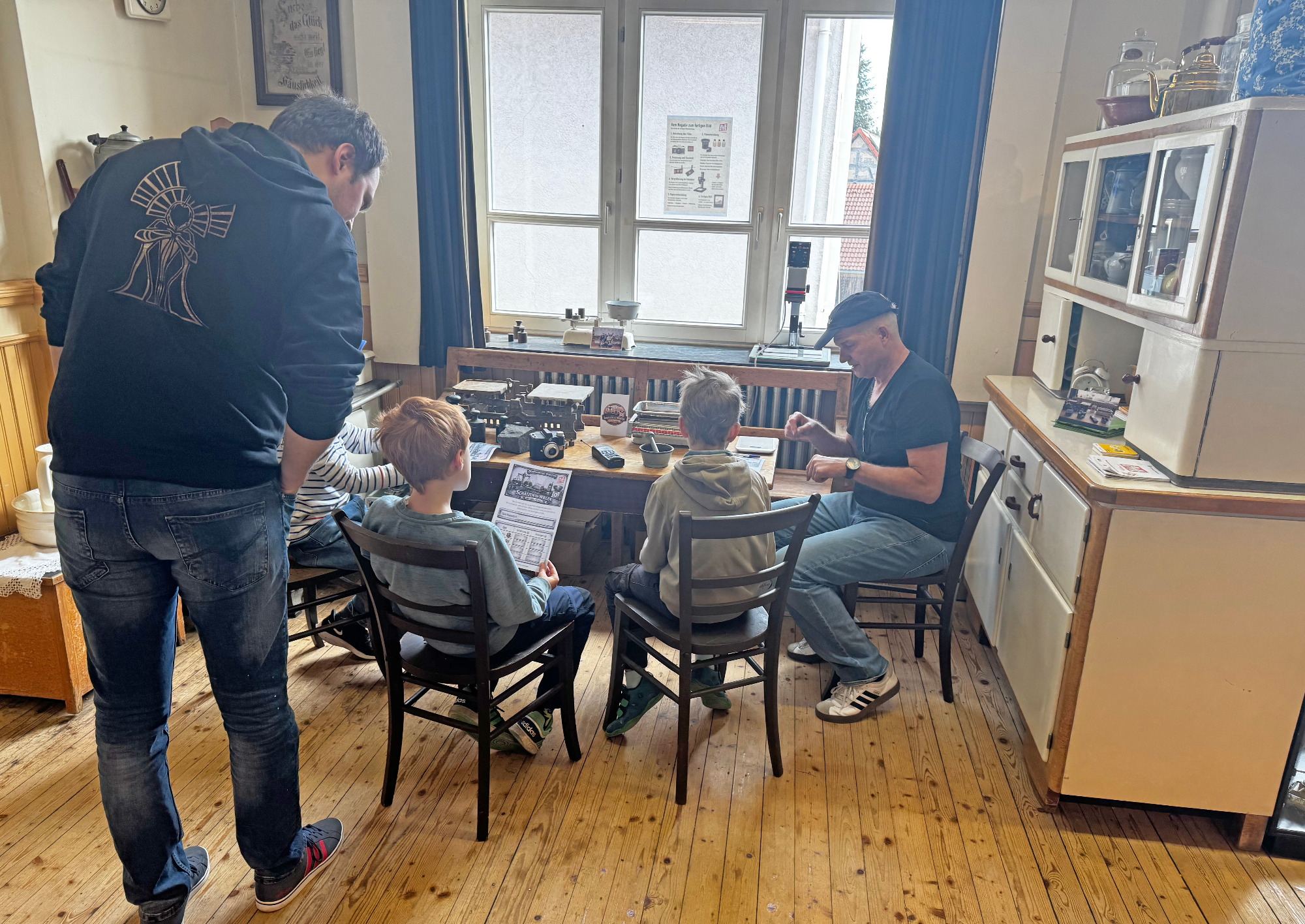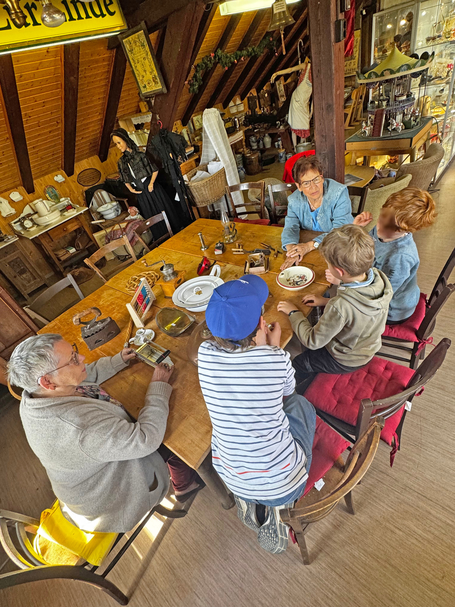 Bei Station 1 ging es um Alltagsgegenstände von vor 100 Jahren. Gemeinsam mit Dorothee und Elvira entdeckten die Kinder, welche Dinge früher ganz selbstverständlich zum Leben gehörten und wie sehr sich unser Alltag bis heute verändert hat.