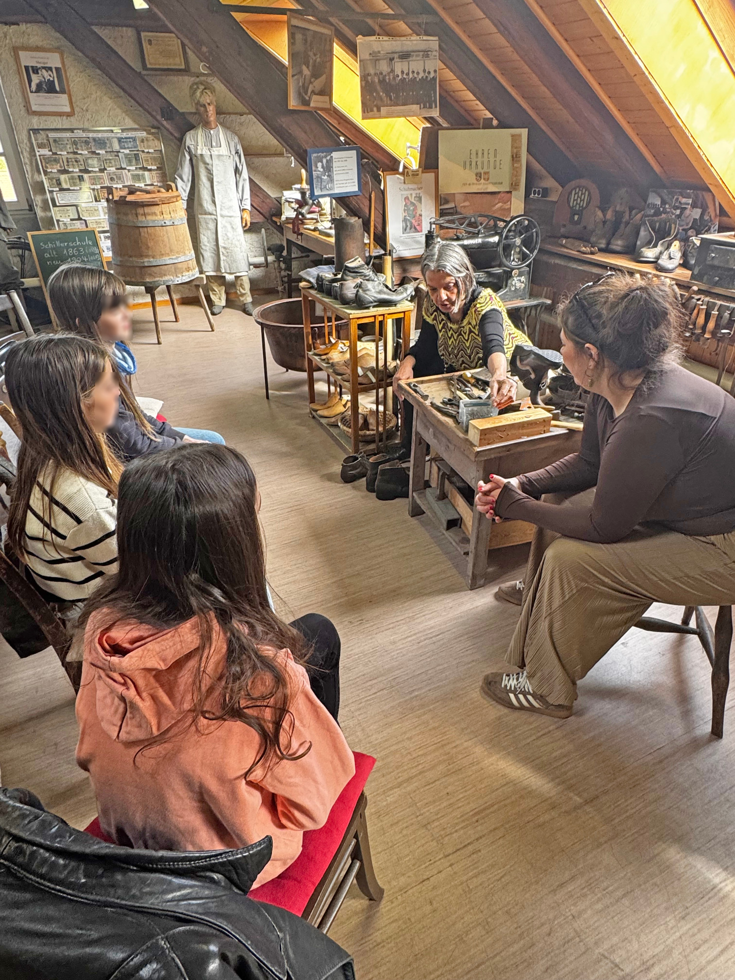 An Station 2 wurde es besonders anschaulich in der Schuhmacherwerkstatt. Dort erhielten die Kinder spannende Einblicke in ein altes Handwerk. Begleitet wurde diese Station von der echten Schuhmachermeisterin Regina Lotz, gemeinsam mit Assistentin Paula und Assistent Berti. Das war nicht nur interessant, sondern für viele sicher ein ganz besonderes Erlebnis.