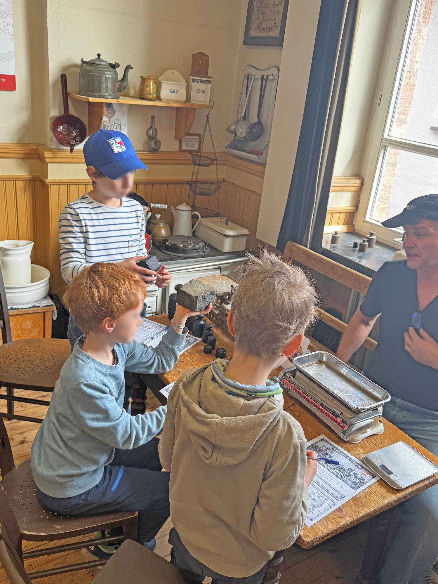 Bei Station 3 konnten die Kinder mit alten Waagen selbst ausprobieren, wie früher gewogen wurde. Unter der Anleitung von Stefan wurde verglichen, geschätzt und gestaunt. So wurde auch diese Station zu einer lebendigen Erfahrung mit historischem Bezug.